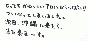 最終更新日 2008.06.06 今日は残念ながら沖縄は雨・・・でも♪そんな中、来店された名古屋からのカップルさん♪♪彼女の方は大好きな甥っ子君にお土産だそうです(*´▽`*)~☆二人はダイビングを楽しんできた様でアロハ…