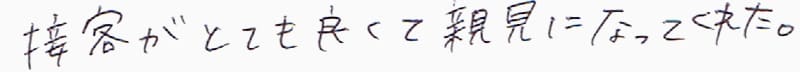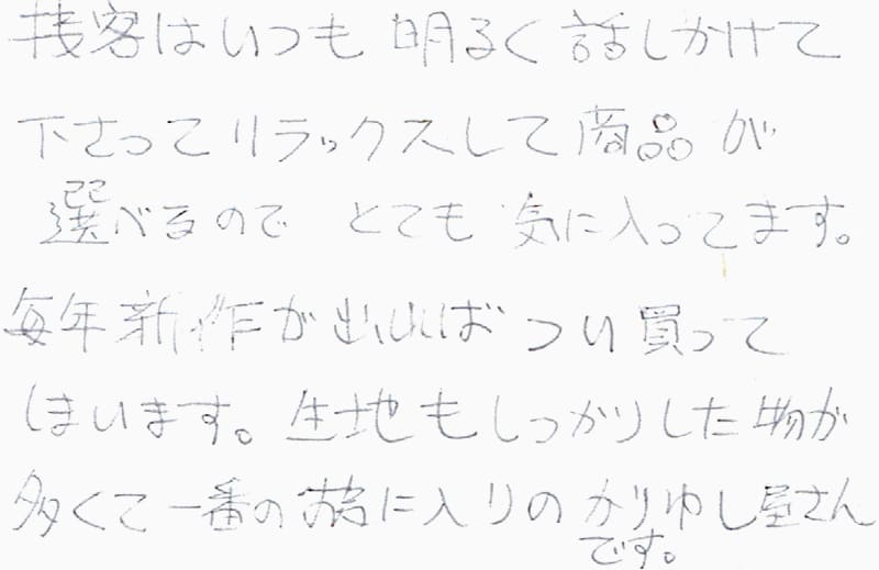 接客はいつも明るく話しかけて下さってリラックスして商品が選べるのでとても気に入ってます。毎年新作が出ればつい買ってしまいます。生地もしっかりした物が多くて一番のお気に入りのかりゆし屋さんです。