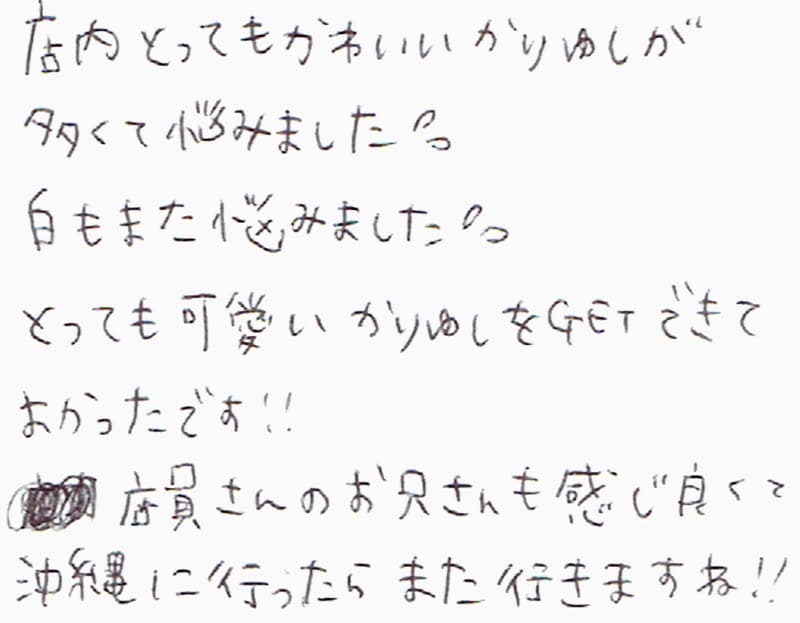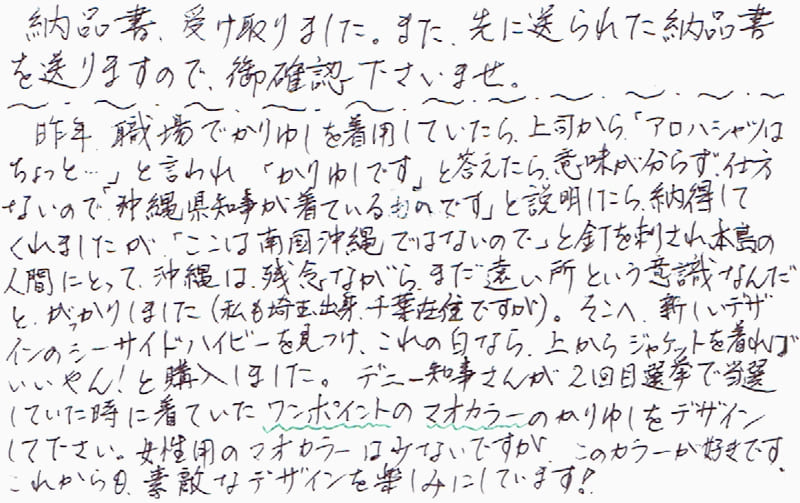 今月3日に寄らせて頂きました。かりゆしウェア2枚、サコッシュを買って大満足。本当は黄色のかりゆしも欲しかったけど、サイズが無く白にしました。残念。でも、2枚共気に入っております。接客してくれた女の子もとてもていねいで良かったです。又、そちらに行く際は、必ず寄らせて頂きますので、よろしくお願いします。