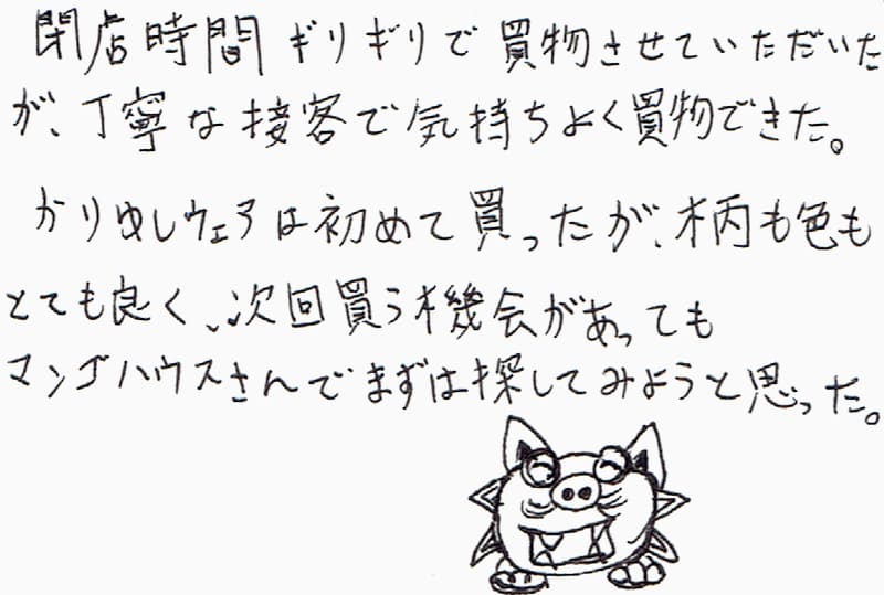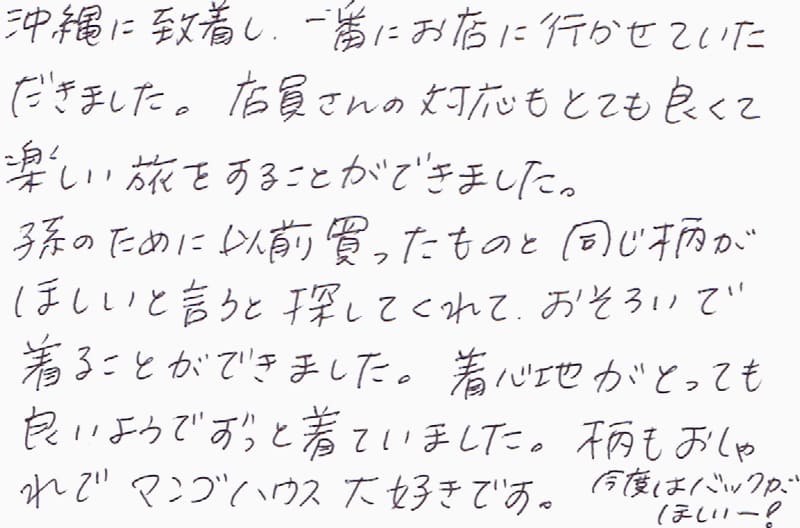 沖縄に到着し、一番にお店に行かせていただきました。店員さんの対応もとても良くて楽しい旅をすることができました。孫のために以前買ったものと同じ柄がほしいと言うと探してくれて、おそろいで着ることができました。着心地がとっても良いようでずっと着ていました。柄もおしゃれでマンゴハウス大好きです。今度はバックがほしいー!