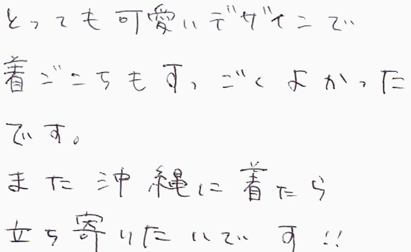 とっても可愛いデザインで着ごこちもすっごくよかったです。また沖縄に着たら立ち寄りたいです!!