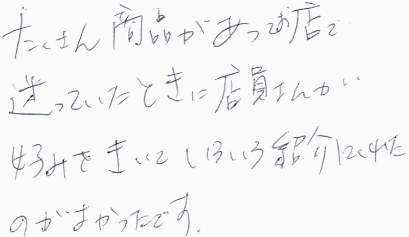 たくさん商品があって、お店で迷っていたときに店員さんが好みをきいていろいろ紹介してくれたのがよかったです。