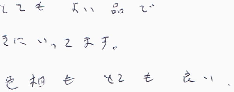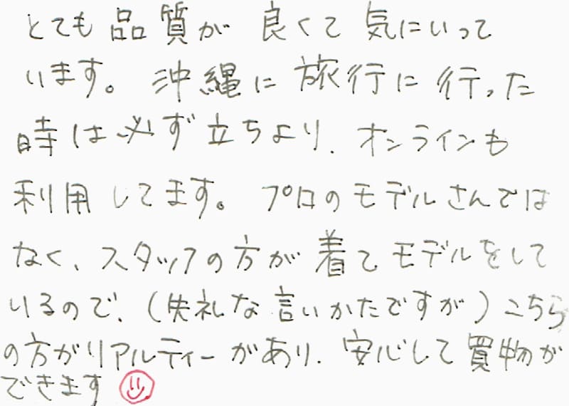 とても品質が良くて気にいっています。沖縄に旅行に行った時は必ず立ちより、オンラインも利用してます。プロのモデルさんではなく、スタッフの方が着てモデルをしているので、(失礼な言いかたですが)こちらの方がリアルティーがあり、安心して買物ができます。