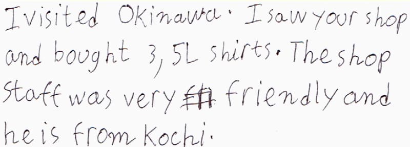 I visited Okinawa.I saw your shop and bought 3,5L shirts.The shop staff was very friendly and he is from Kochi.