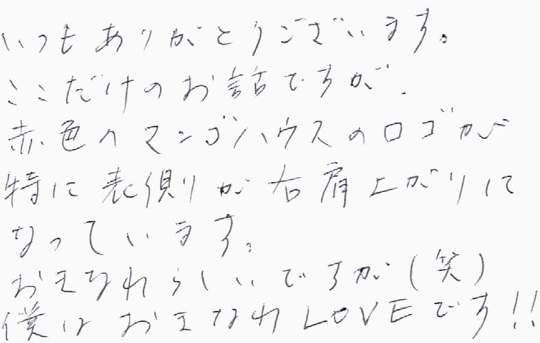 いつもありがとうございます。ここだけのお話ですが、赤色のマンゴハウスのロゴが特に表側が右肩上がりになっています。おきなわらしいですが(笑)僕はおきなわLOVEです!!