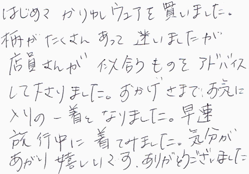 はじめてかりゆしウェアを買いました。柄がたくさんあって迷いましたが店員さんが似合うものをアドバイスして下さりました。おかげさまで、お気に入りの一着となりました。早速旅行中に着てみました。気分があがり嬉しいです。ありがとうございました。