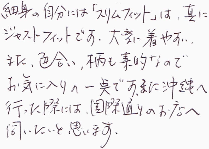 細身の自分には「スリムフィット」は、真にジャストフィットです。大変着やすい。また、色合い、柄も素的なので、お気に入りの一点です。また沖縄へ行った際には、国際通りのお店へ伺いたいと思います。