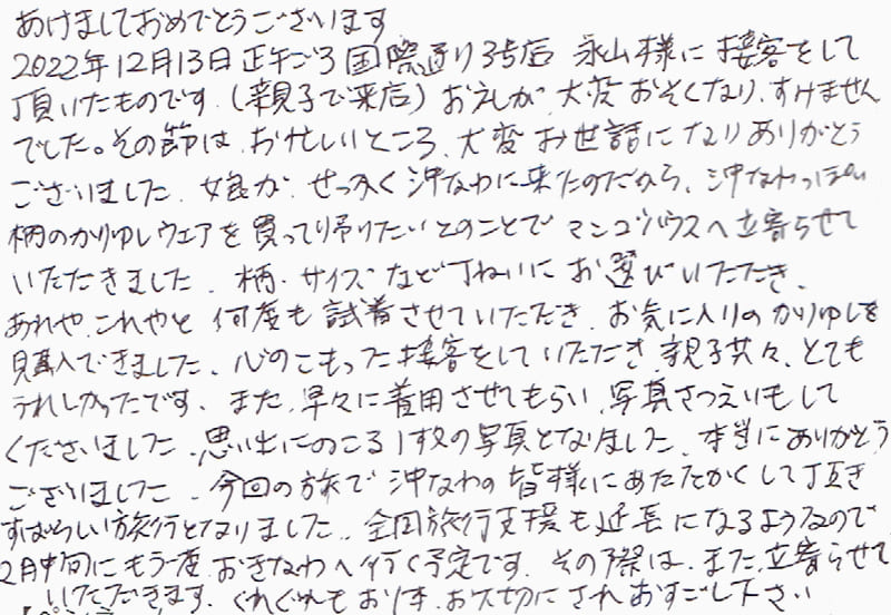 あけましておめでとうございます。2022年12月13日正午ごろ国際通り3号店、永山様に接客をして頂いたものです。(親子で来店)お礼が大変おそくなり、すみませんでした。その節は、お忙しいところ、大変お世話になりありがとうございました。娘が、せっかく沖なわに来たのだから、沖なわっぽい柄のかりゆしウェアを買って帰りたいとのことでマンゴハウスへ立寄らせていただきました。柄、サイズなど丁ねいにお選びいただき、あれやこれやと何度も試着させていただき、お気に入りのかりゆしを購入できました。心のこもった接客をしていただき、親子共々、とてもうれしかったです。また、早々に着用させてもらい、写真さつえいもしてくださいました。思い出にのこる1枚の写真となりました。本当にありがとうございました。今回の旅で沖なわの皆様にあたたかくして頂きすばらしい旅行となりました。全国旅行支援も延長になるようなので2月中旬にもう一度おきなわへ行く予定です。その際は、また、立寄らせていただきます。くれぐれもお体、大切にされおすごし下さい。