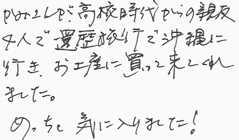 かみさんが、高校時代からの親友4人で還暦旅行で沖縄に行き、お土産に買って来てくれました。めっちゃ気に入りました!