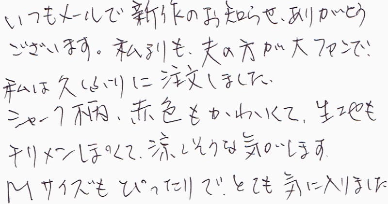 いつもメールで新作のお知らせ、ありがとうございます。私よりも、夫の方が大ファンで、私は久しぶりに注文しました。シャーク柄、赤色もかわいくて、生地もチリメンぽくて、涼しそうな気がします。Mサイズもぴったりで、とても気に入りました。