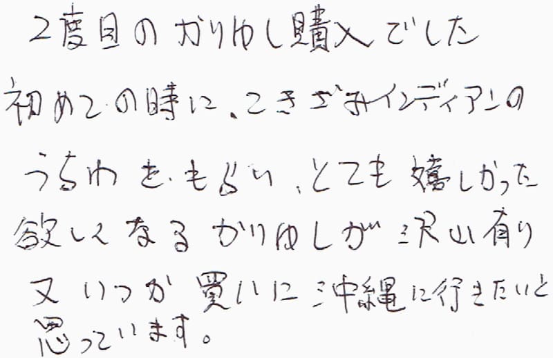2度目のかりゆし購入でした。初めての時に、こぎざみインディアンのうちわをもらい、とても嬉しかった。欲しくなりかりゆしが沢山有り、又いつか買いに沖縄に行きたいと思っています。