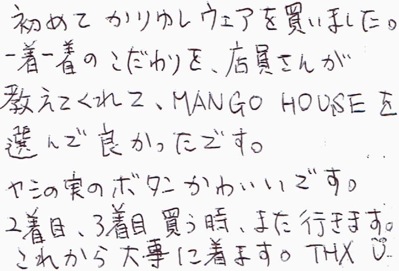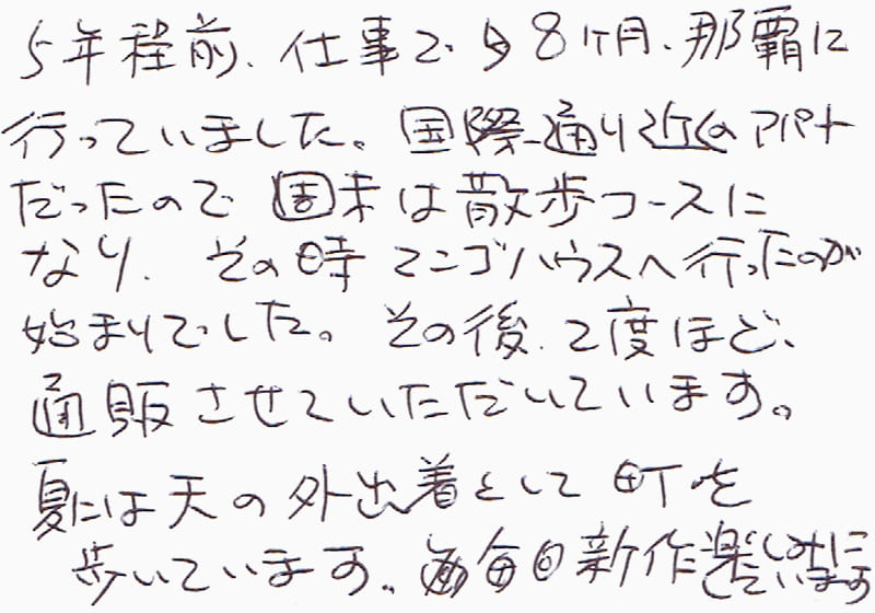 5年程前、仕事で8ヶ月、那覇に行っていました。国際通り近くのアパートだったので、週末は散歩コースになり、その時マンゴハウスへ行ったのが始まりでした。その後、2度ほど、通販させていただいています。夏には天の外出着として町を歩いています。毎回新作楽しみにしています。