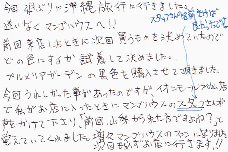 今回2月ぶりに沖縄旅行に行きました。迷いなくマンゴハウスへ!!前回来店したときに次回買うものを決めていたので、どの色にするか試着して決めました。プルメリアガーデンの黒色を購入させて頂きました。今回うれしかった事があったのですが、イオンモールライカム店で私がお店に入ったときにマンゴハウスのスタッフさんが声をかけて下さり、「前回、山梨から来た方ですよね?」と覚えていてくれました。増々マンゴハウスのファンになりました。次回も必ずお店に行きます!!