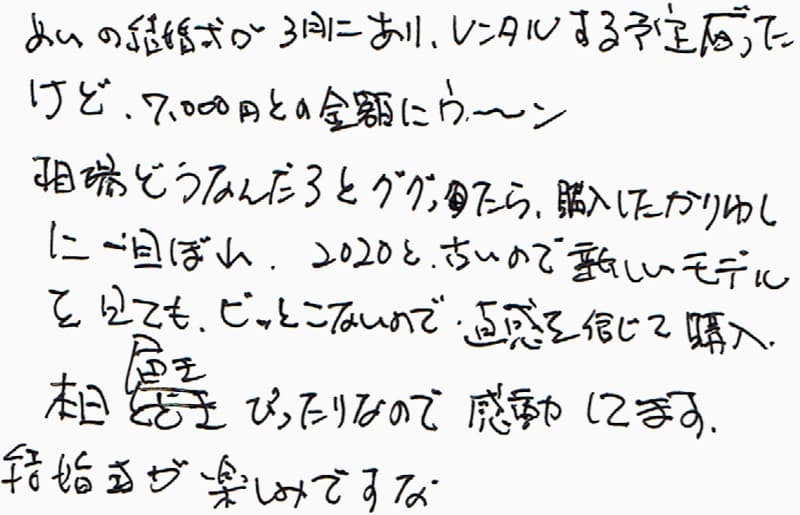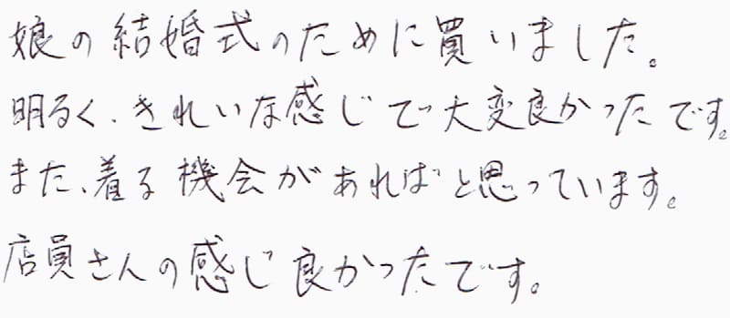 娘の結婚式のために買いました。明るく、きれいな感じで大変良かったです。また、着る機会があればと思っています。店員さんの感じ良かったです。