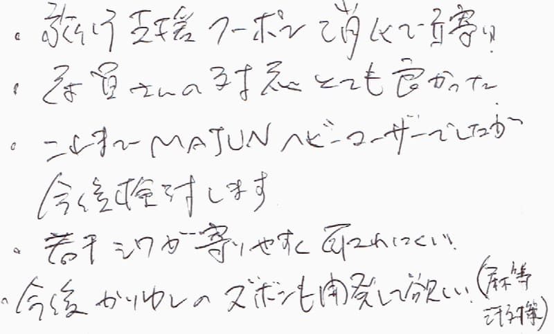 ・旅行支援クーポン消化で立寄り。・店員さんの対応とても良かった。・これまでMAJUNヘビーユーザーでしたが、今後検討します。・若干シワが寄りやすく取れにくい。・今後かりゆしのズボンも開発して欲しい。