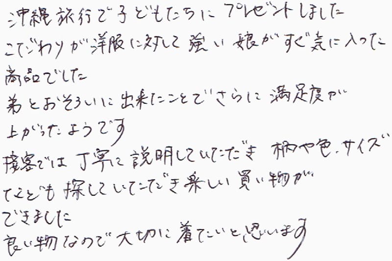 沖縄旅行で子どもたちにプレゼントしました。こだわりが洋服に対して強い娘がすぐ気に入った商品でした。弟とおそろいに出来たことでさらに満足度が上がったようです。接客では丁寧に説明していただき、柄や色、サイズなども探していただき楽しい買い物ができました。良い物なので大切に着たいと思います。