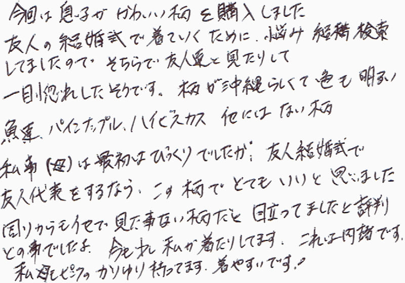 今回は息子がかわいい柄を購入しました。友人の結婚式で着ていくために、悩み、結構検索してましたのでそちらで友人達と見たりして、一目惚れしたそうです。柄が沖縄らしくて色も明るい魚達、パインナップル、ハイビスカス、他にはない柄。私事(母)は最初はびっくりでしたが、友人結婚式で友人代表をするなら、この柄でとてもいいと思いました。周りからも他で見た事ない柄だと目立ってましたと評判との事でしたよ。今も少し私が着たりしてます。これは内緒です。私母もピンクのかりゆし持ってます。着やすいです!