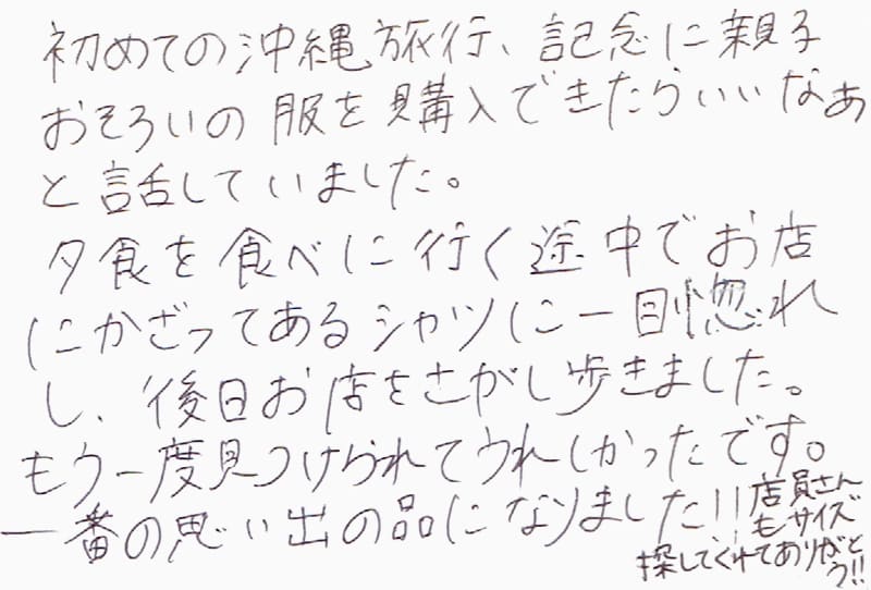 初めての沖縄旅行、記念に親子おそろいの服を購入できたらいいなぁと話していました。夕食を食べに行く途中でお店にかざってあるシャツに一目惚れし、後日お店をさがし歩きました。もう一度見つけられてうれしかったです。一番の思い出の品になりました!!店員さんもサイズ探してくれてありがとう!!