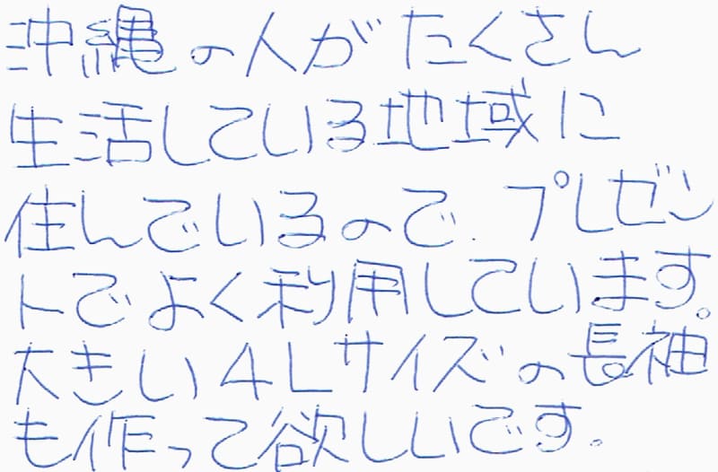 沖縄の人がたくさん生活している地域に住んでいるので、プレゼントでよく利用しています。大きい4Lサイズの長袖も作って欲しいです。