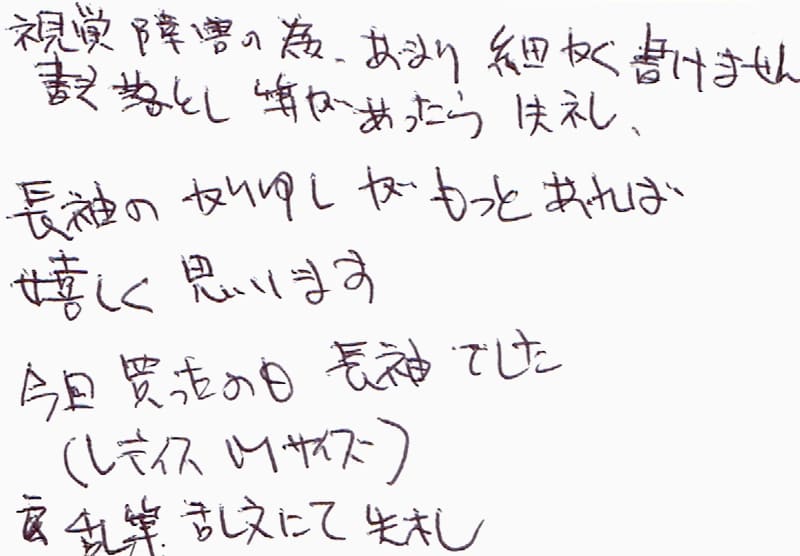 視覚障害の為、あまり細かく書けません。書き落とし等があったら失礼。長袖のかりゆしがもっとあれば嬉しく思います。今回買ったのも長袖でした。(レディスMサイズ)乱筆、乱文にて失礼。