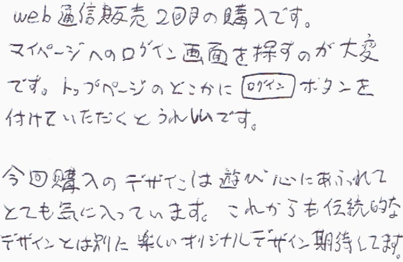 web通信販売2回目の購入です。マイページへのログイン画面を探すのが大変です。トップページのどこかに【ログイン】ボタンを付けていただくとうれしいです。今回購入のデザインは遊び心にあふれて、とても気に入っています。これからも伝統的なデザインとは別に楽しいオリジナルデザイン期待してます。