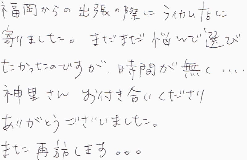 福岡からの出張の際にライカム店に寄りました。まだまだ悩んで選びたかったのですが、時間が無く…。神里さんがお付き合いくださりありがとうございました。また再訪します。。。