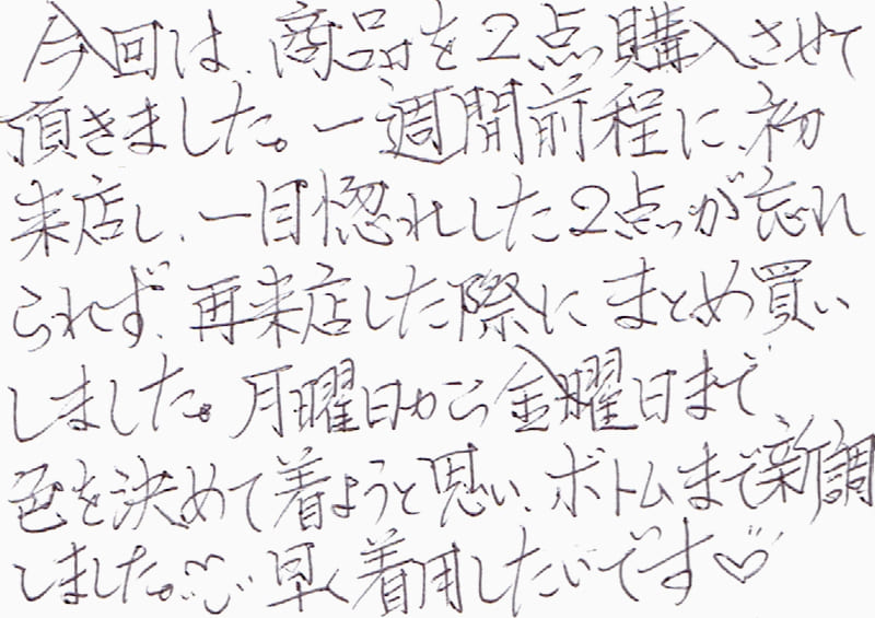 今回は、商品を2点購入させて頂きました。一週間前程に、初来店し、一目惚れした2点が忘れられず、再来店した際にまとめ買いしました。月曜日から金曜日まで、色を決めて着ようと思い、ボトムまで新調しました。早く着用したいです。