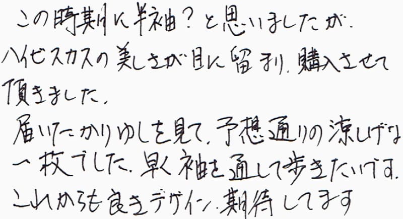 この時期に半袖?と思いましたが、ハイビスカスの美しさが目に留まり、購入させて頂きました。届いたかりゆしを見て、予想通りの涼しげな一枚でした。早く袖を通して歩きたいです。これからも良きデザイン、期待してます。