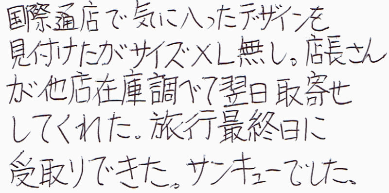 国際通店で気に入ったデザインを見付けたがサイズXL無し。店長さんが他店在庫調べて翌日取寄せしてくれた。旅行最終日に受取りできた。サンキューでした。