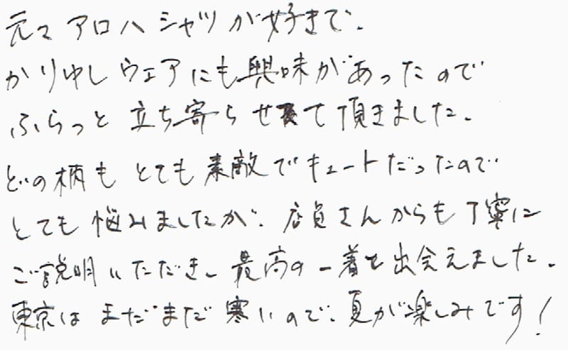 元々アロハシャツが好きで、かりゆしウェアにも興味があったので、ふらっと立ち寄らせて頂きました。どの柄もとても素敵でキュートだったので、とても悩みましたが、店員さんからも丁寧にご説明いただき、最高の一着と出会えました。東京はまだまだ寒いので、夏が楽しみです!