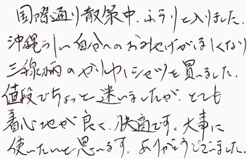 国際通り散策中、ふらりと入りました。沖縄らしい自分へのおみやげがほしくなり三線柄のかりゆしシャツを買いました。値段でちょっと迷いましたが、とても着心地が良く、快適です。大事に使いたいと思います。ありがとうございました。
