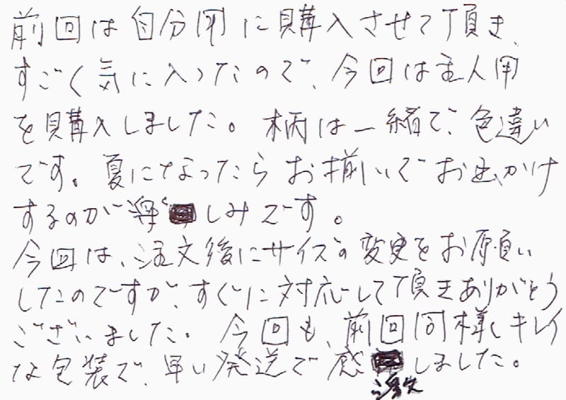 前回は自分用に購入させて頂き、すごく気に入ったので、今回は主人用を購入しました。柄は一緒で、色違いです。夏になったらお揃いでお出かけするのが楽しみです。今回は、注文後にサイズの変更をお願いしたのですが、すぐに対応して頂きありがとうございました。今回も前回同様キレイな包装で、早い発送で感激しました。