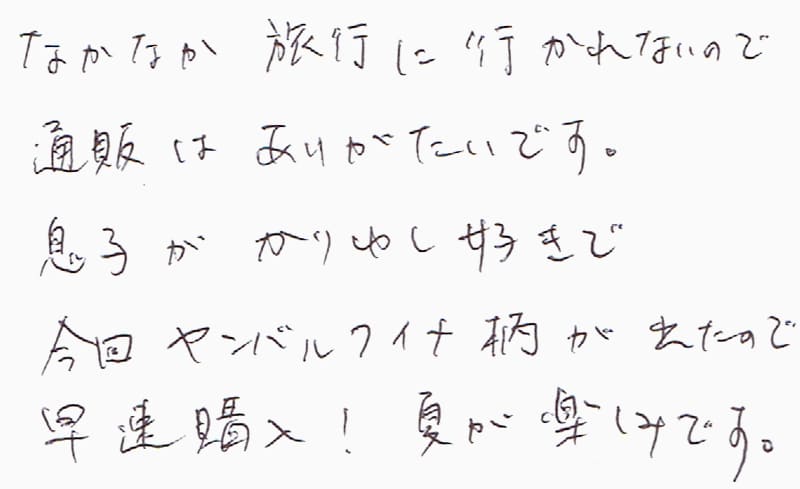 なかなか旅行に行かれないので通販はありがたいです。息子がかりゆし好きで今回ヤンバルクイナ柄が出たので早速購入!夏が楽しみです。