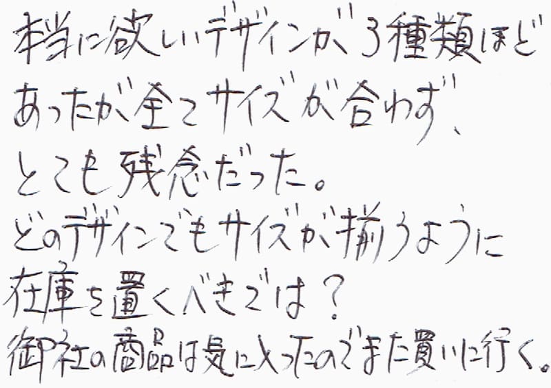 本当に欲しいデザインが3種類ほどあったが全てサイズが合わず、とても残念だった。どのデザインでもサイズが揃うように在庫を置くべきでは?御社の商品は気に入ったのでまた買いに行く。