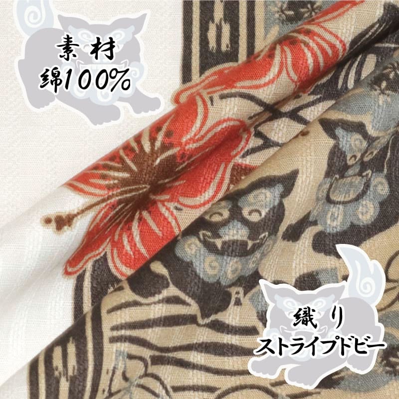 咲き誇るブーゲンベレアの隙間から見える赤瓦民家、そして守り神のシーサー。昔ながらの沖縄の風景をイメージし、光沢のある上品な生地に描きました。沖縄を感じながら楽しんで欲しいデザインです♪沖縄のアロハシャツ(かりゆしウェア)。