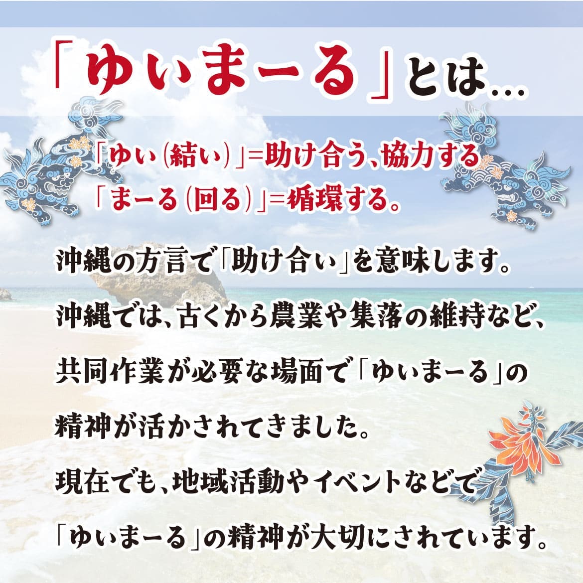 沖縄の縁起物シーサーとデイゴを紅型風に描いた情緒あるデザイン。固く結ばれた絆の言葉を沖縄方言で「ゆいまーる」と表現します。シーサーと沢山の幸せが降り注ぐ祝いの一着!