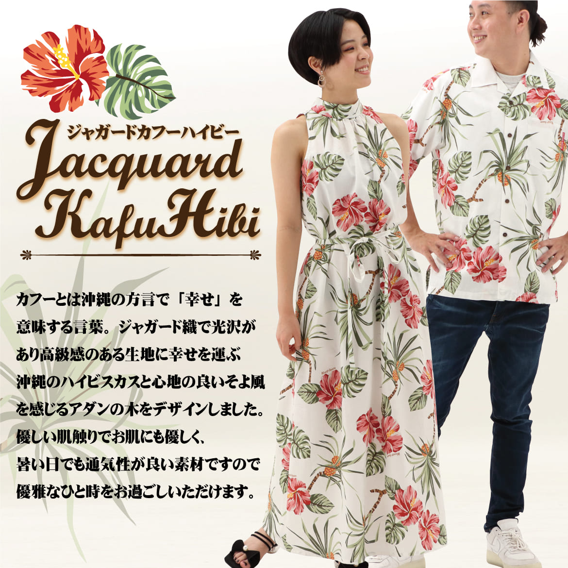 高級感のあるジャガード織生地に美らデザインをのせて沖縄のカフー(幸せ)をお届け致します。優しい肌ざわりで優雅なひと時をエスコートする大人のカフーリゾートウェア。沖縄のアロハシャツ(かりゆしウェア)。