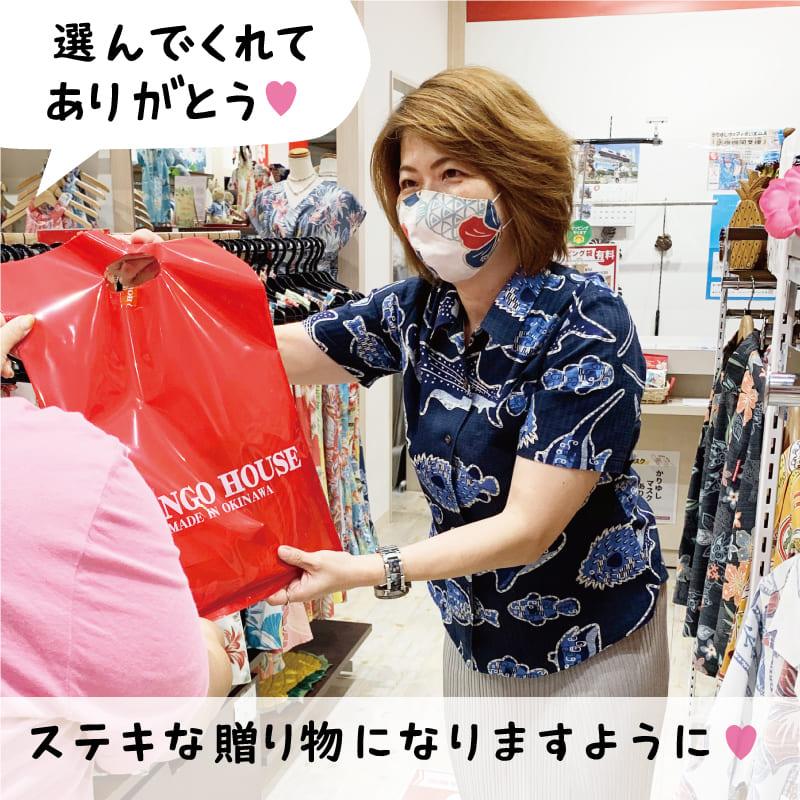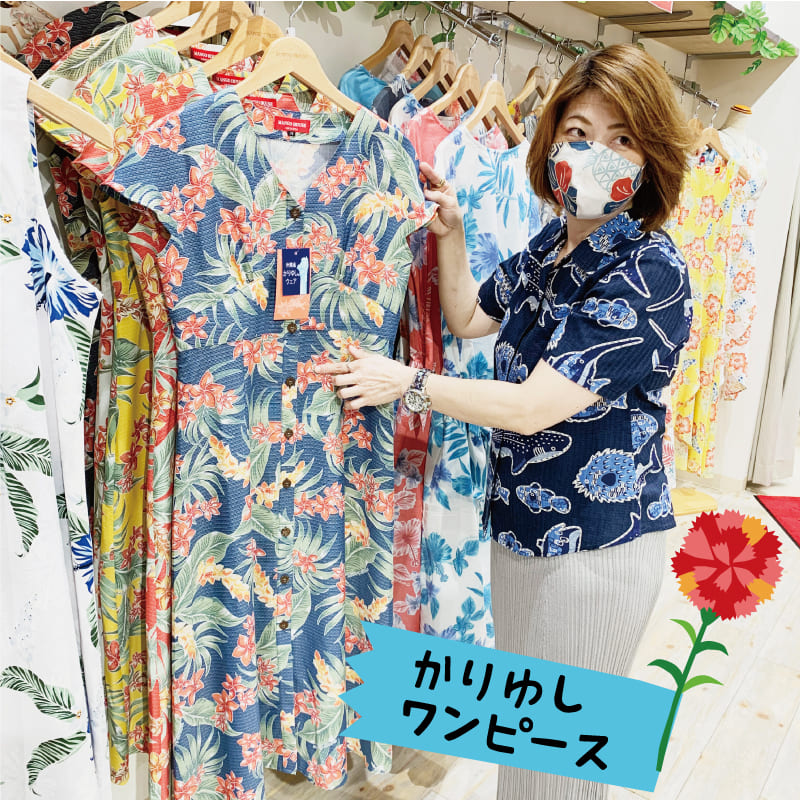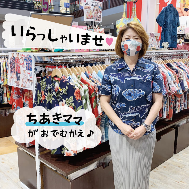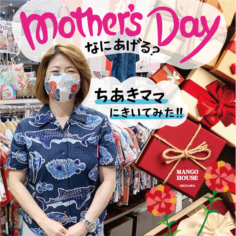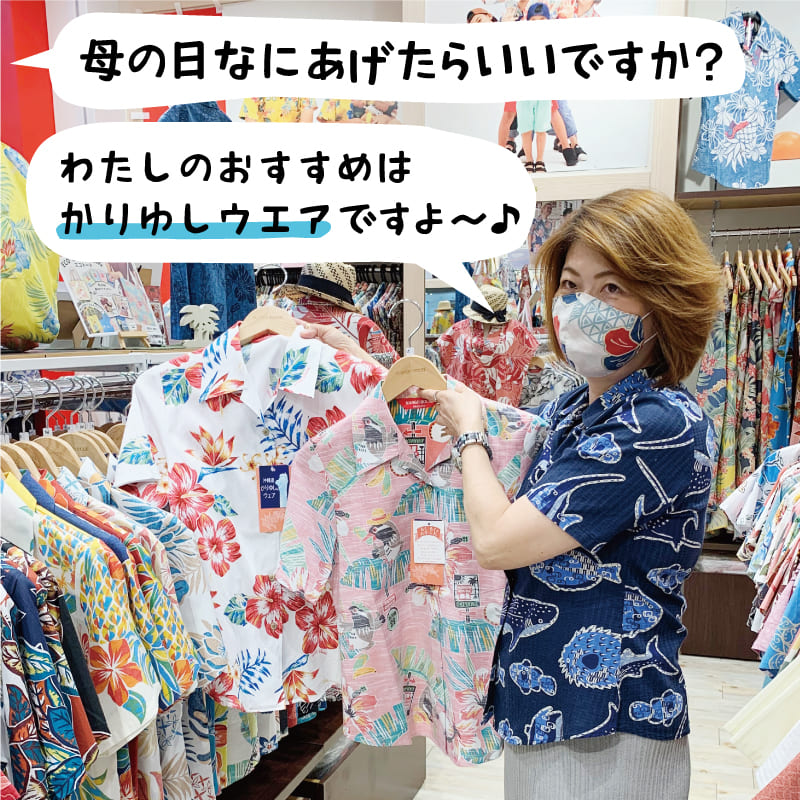 母の日が近づいてきました。今年の母の日は、何を贈りますか?かりゆしウェア専門店マンゴハウスのイオンモールライカム店で、ちあきママにおすすめのシャツをチョイスしていただきました♪