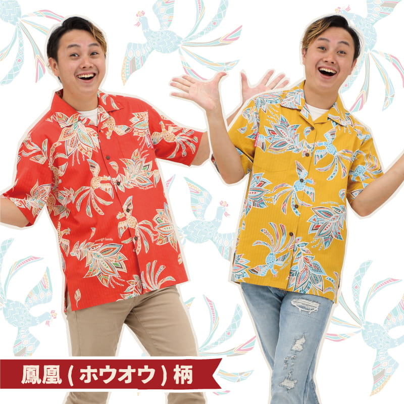 琉球時代からの守り神【鳳凰(ホウオウ)】柄♪鳳凰は吉祥(きっしょう)の象徴ともいわれているので 幸せなことがあるかも☆マンゴハウスでは数少ない鳳凰柄ですが、明るく個性が光る一着になっております♪