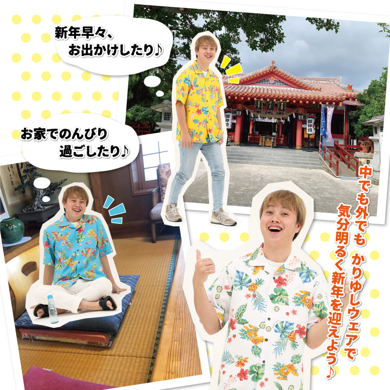 お出かけしたり、お家でゆっくり過ごしたり。新年の過ごし方は人それぞれ♪外でも中でも、かりゆしウェアを着て 気分明るく新年を迎えてみては!?