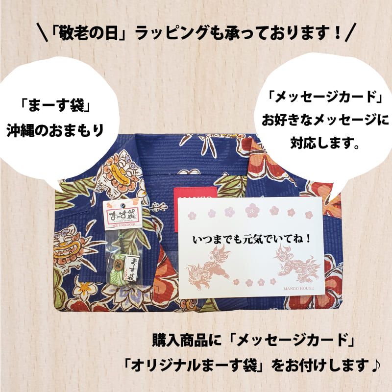もうすぐ敬老の日♪今年は、おじいちゃん、おばあちゃんへの贈り物どうしよう?まだまだ暑い日が続くから、やっぱりここはかりゆしウェアかな!マンゴハウスなら、豊富なデザインを揃えているので贈り物にぴったりです♪