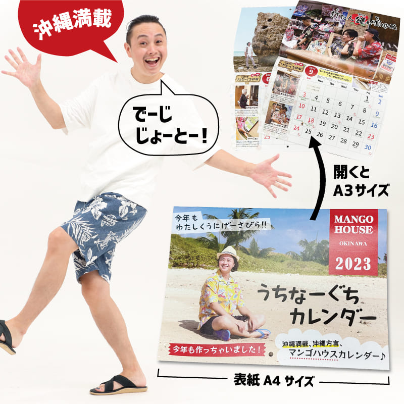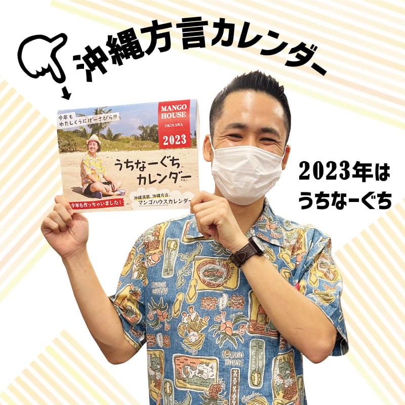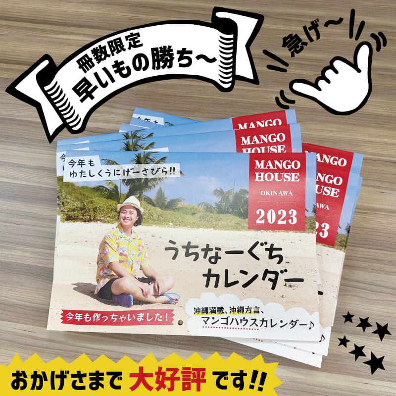 沖縄満載、方言満載、マンゴハウスオリジナル2023 年カレンダーを商品ご購入の方へ先着でプレゼントしております。(雑貨購入は対象外となります)毎年大好評をいただいており、今年は少しだけ多めに制作しましたが…すぐになくなりそうですよ~!