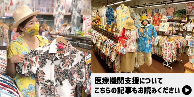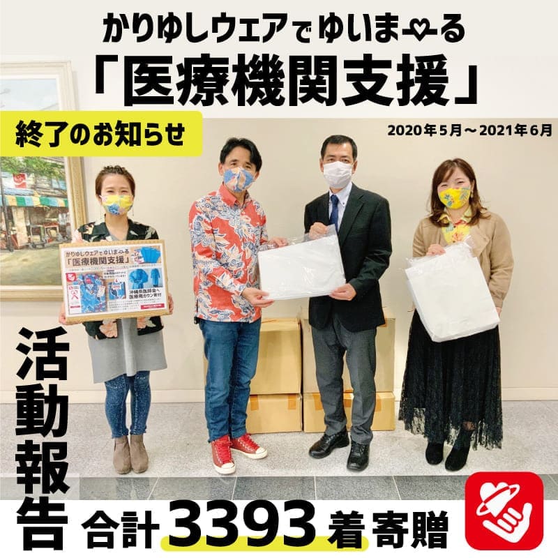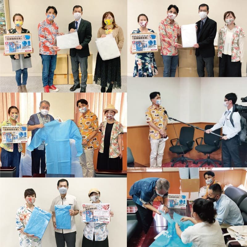 新型コロナウイルス感染症拡大の脅威により沖縄県内及びに離島の医療機関が緊迫した状況となっている中「大好きな沖縄のためにできること」の一つとして、2020年5月よりアパレル沖縄生産協同組合ご協力の元、医療用ガウンを沖縄県医師会へ寄贈しておりました。皆様からの暖かなご支援のおかげで作製した医療用ガウンをすべて寄贈いたしましたので2021年6月をもちまして医療機関支援を終了いたします。ご支援ありがとうございました。