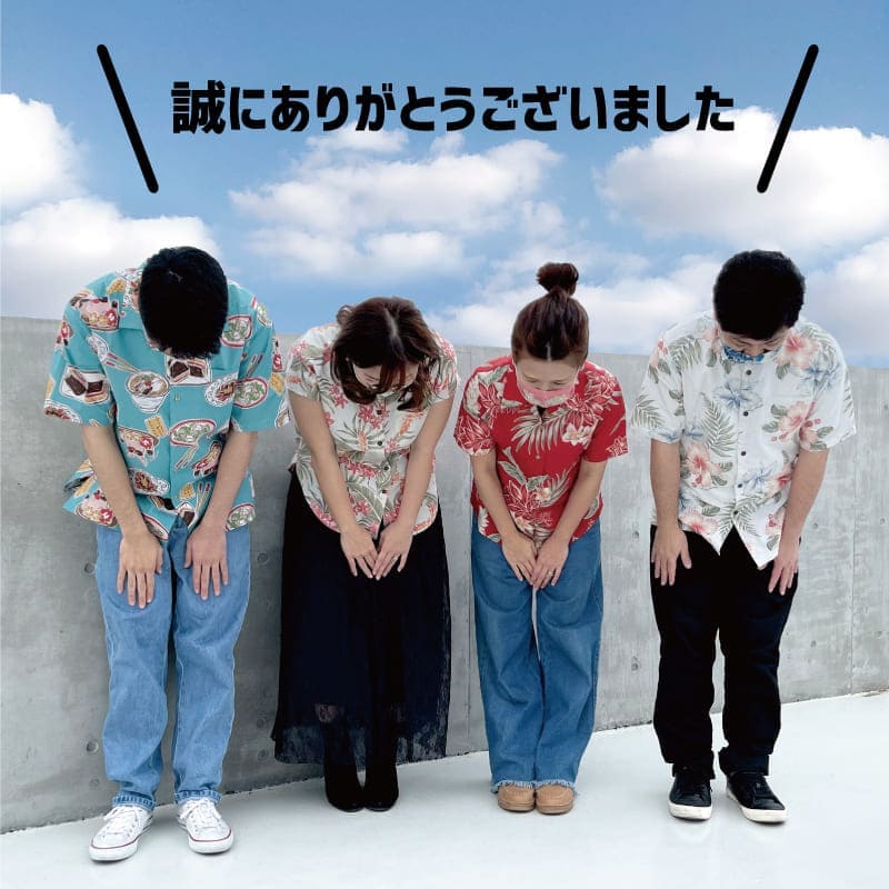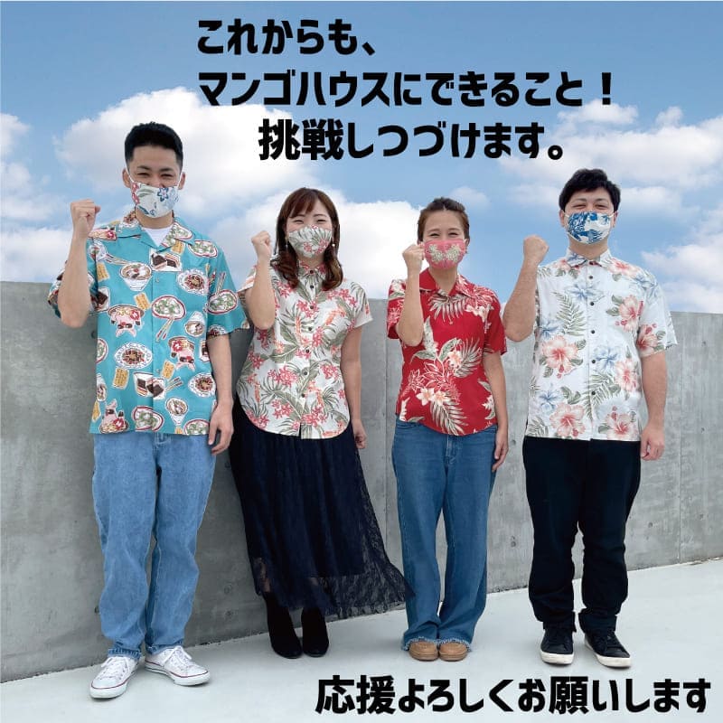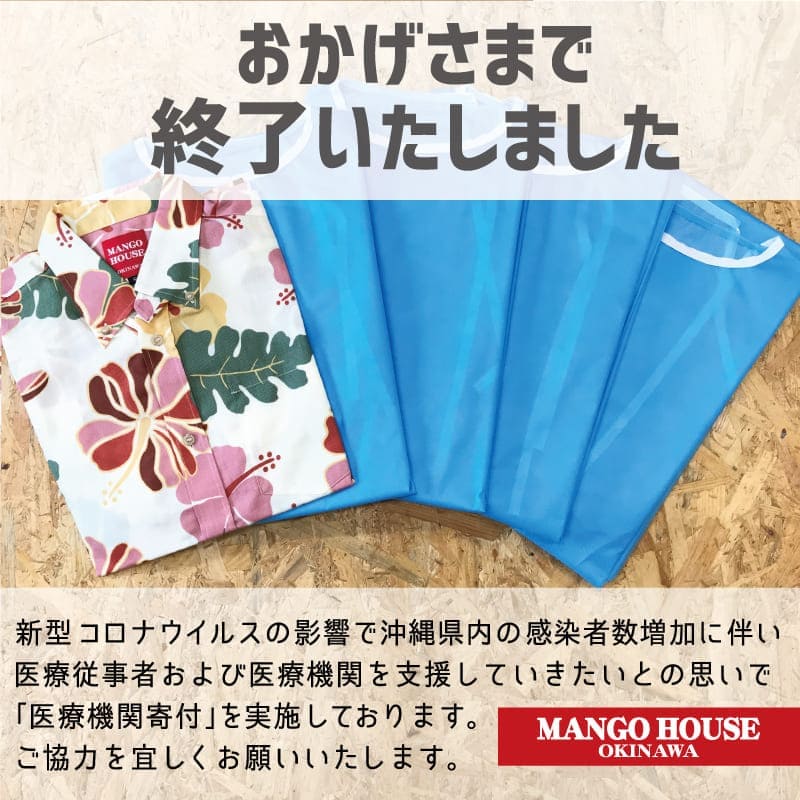 2020年5月~2021年6月にかけ1年間行ってきました「かりゆしウェアでゆいまーる医療機関支援」は作製した医療用ガウンをすべて寄贈した事に伴い終了することになりました。ですが、現在も沖縄県ではまだまだ感染者数が増加しており、ようやくワクチン接種もスタートいたしました。一日も早い新型コロナウィルスの収束を祈い、小さな島の沖縄の力になりたい!元気な沖縄を取り戻したい!という気持ちはこれからも変わらず頑張ってまいります。「かりゆし」ウェアでゆいまーる医療機関支援」は終了いたしますが、これからもマンゴハウスにできることを挑戦し続けますので、これからも応援宜しくお願いいたします。