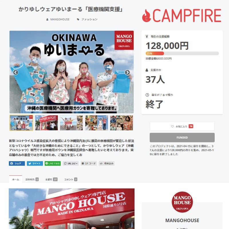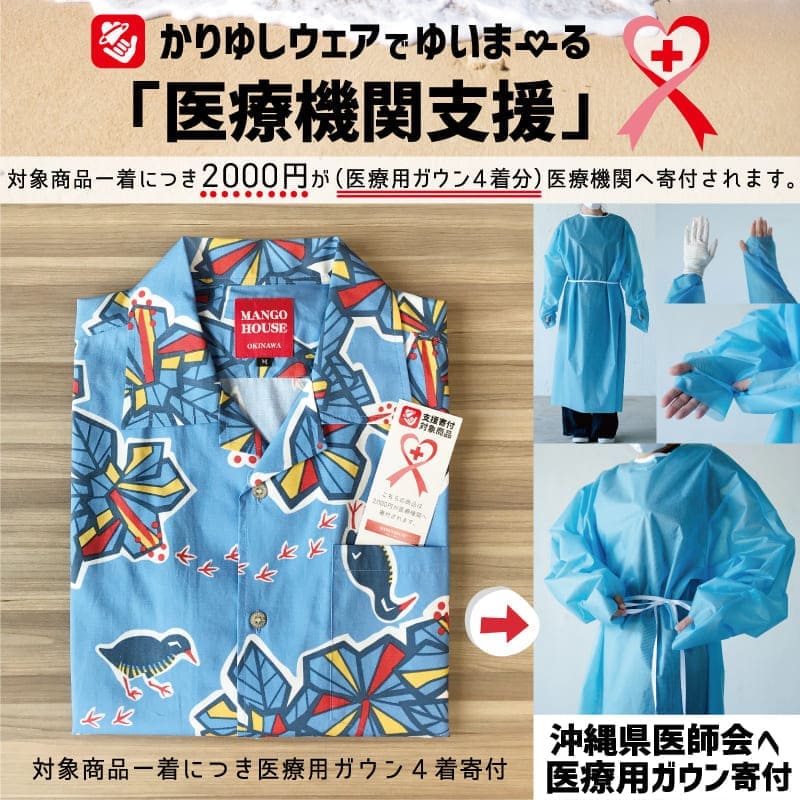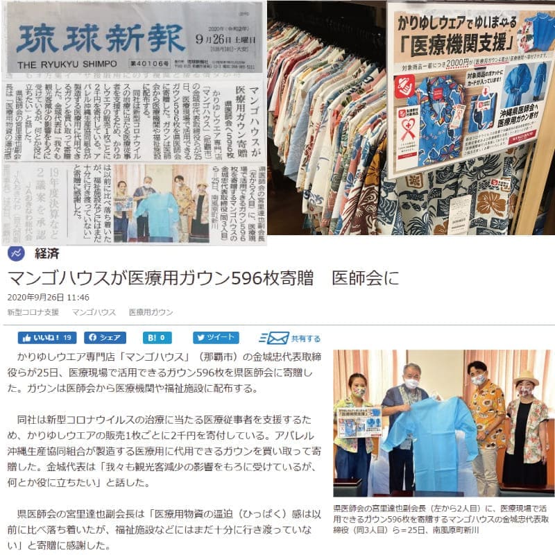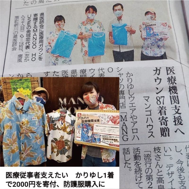 マンゴハウス全6店舗、通信販売サイト、にて2020年5月より医療機関支援として対象商品一着購入につき2000円分の医療用ガウン(4着分)をアパレル沖縄生産協同組合より購入し沖縄県医師会へ寄贈する活動を行いました。