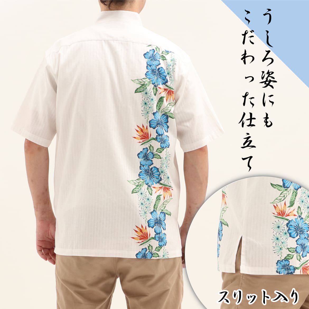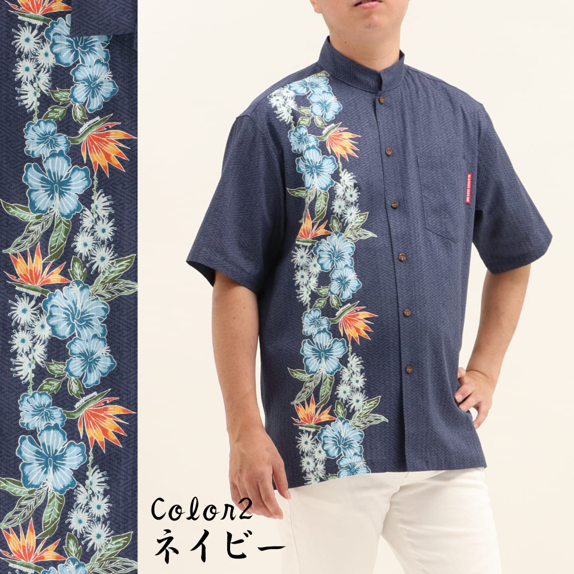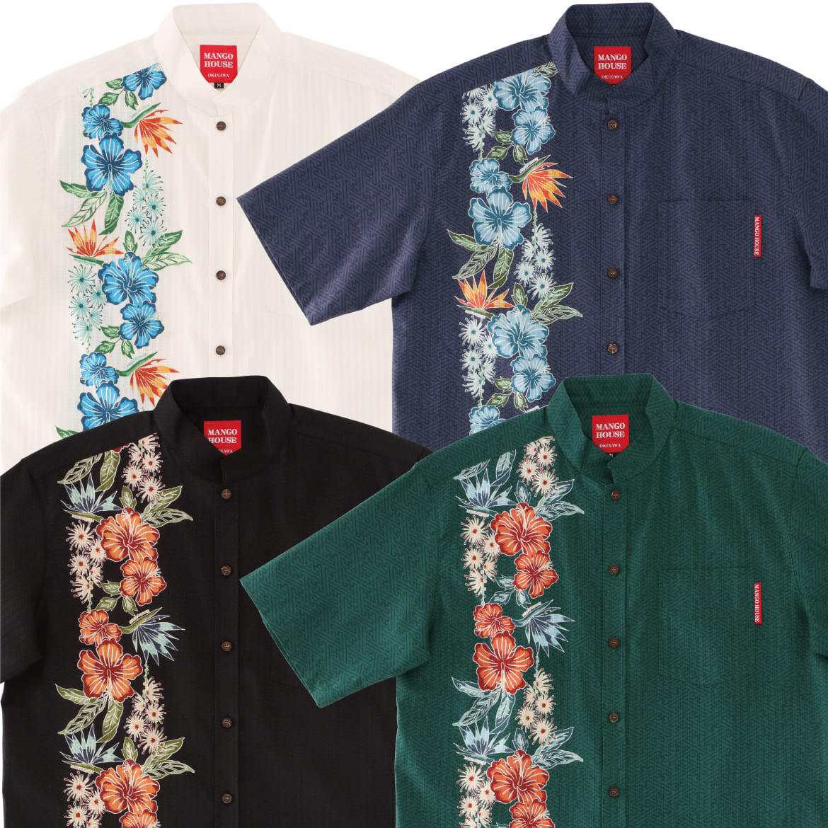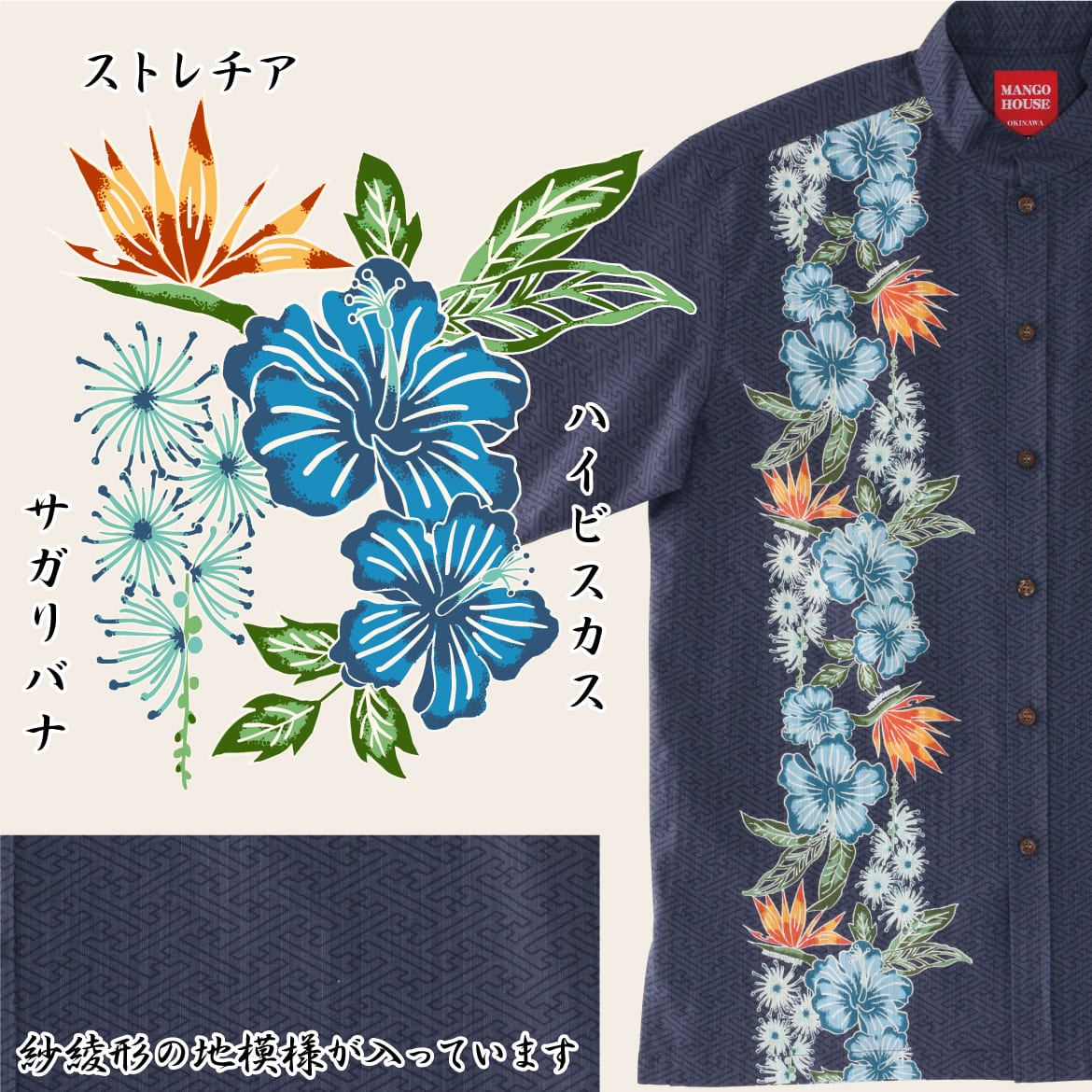 ハイビスカス、ストレチア、サガリバナを沖縄の伝統的な染め織り、紅型で表現。大胆な色使いと繊細なタッチは、涼しげでもシンプルなだけじゃない華やかさを身にまとえる沖縄のアロハシャツ(かりゆしウェア)。
