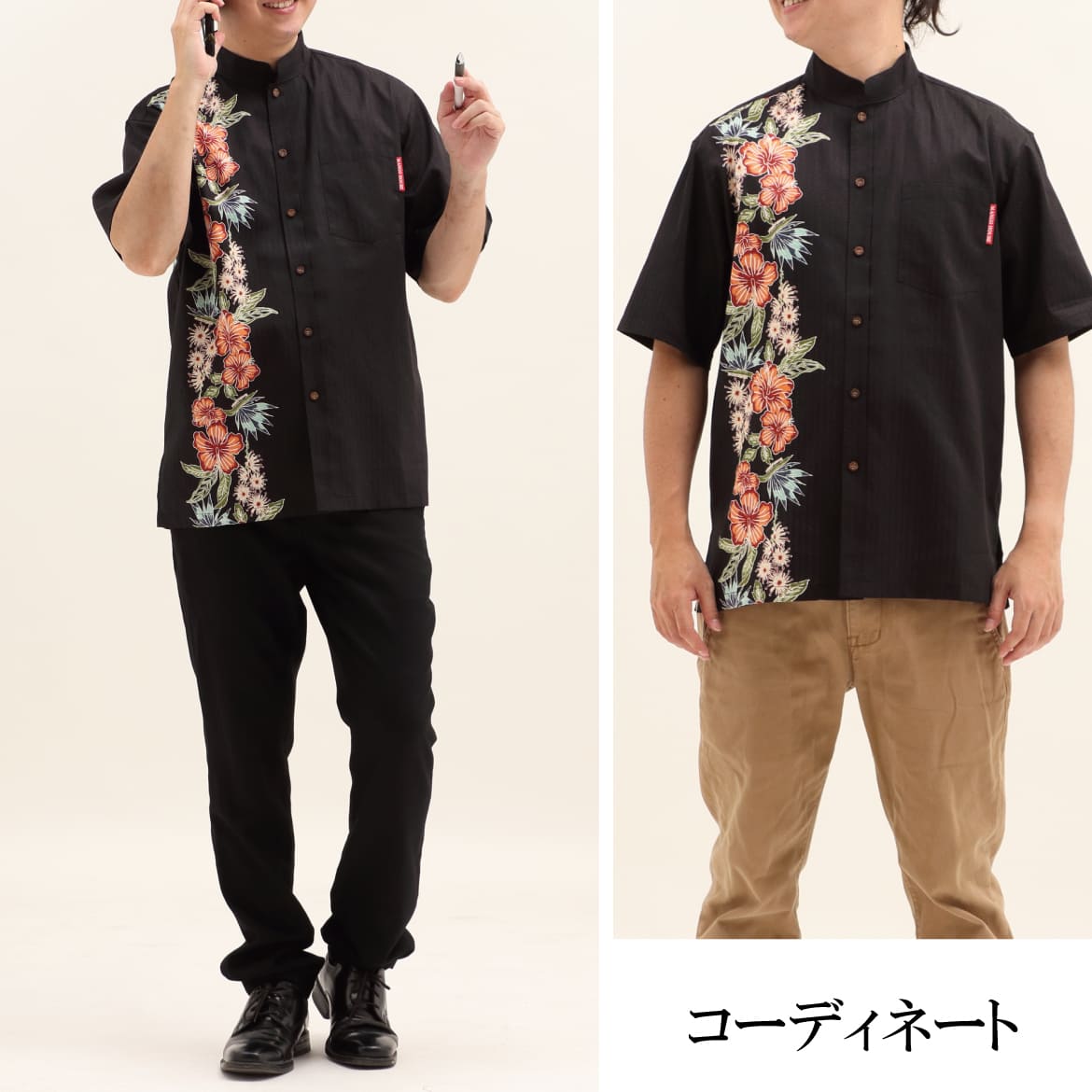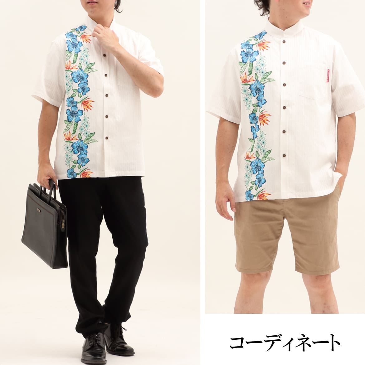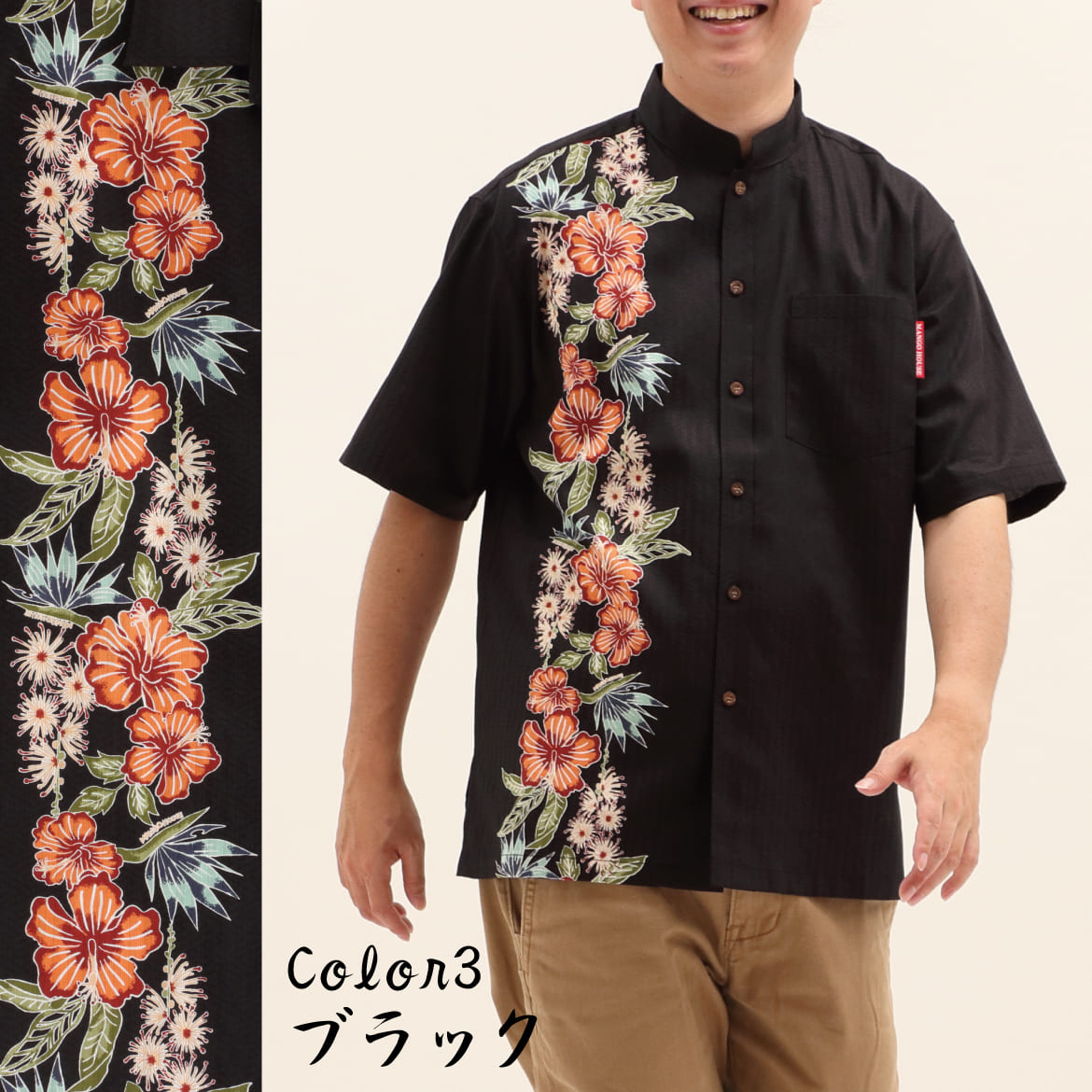 ハイビスカス、ストレチア、サガリバナを沖縄の伝統的な染め織り、紅型で表現。大胆な色使いと繊細なタッチは、涼しげでもシンプルなだけじゃない華やかさを身にまとえる沖縄のアロハシャツ(かりゆしウェア)。
