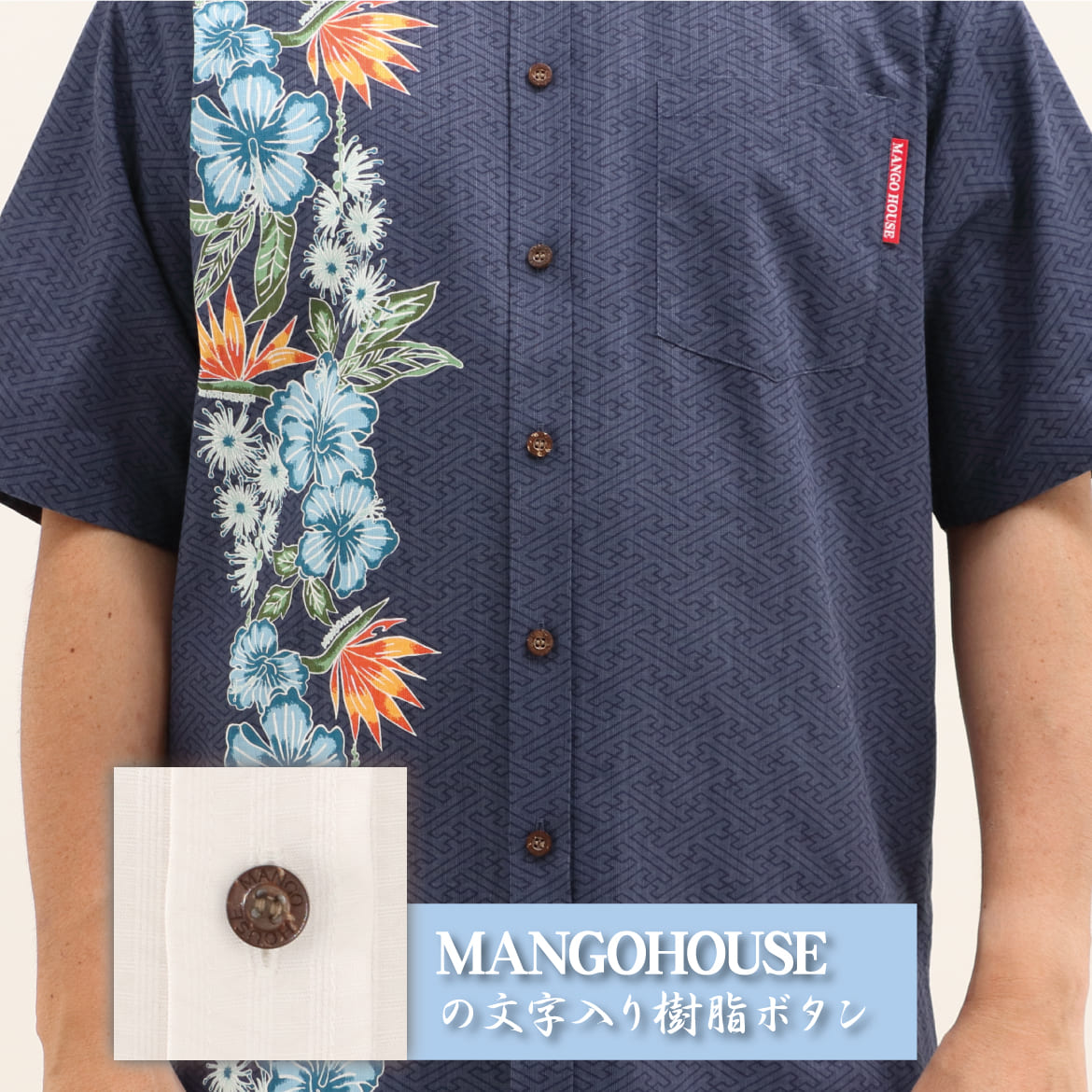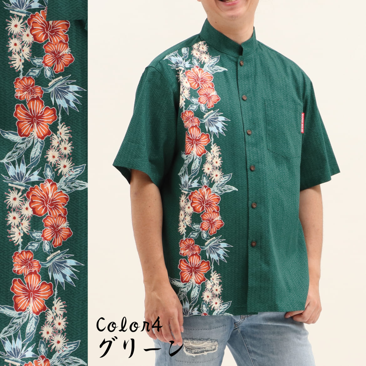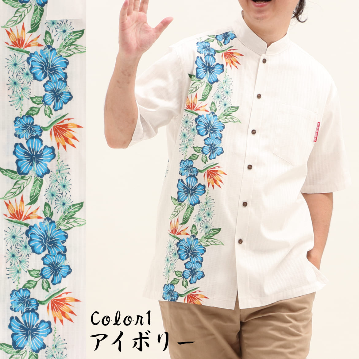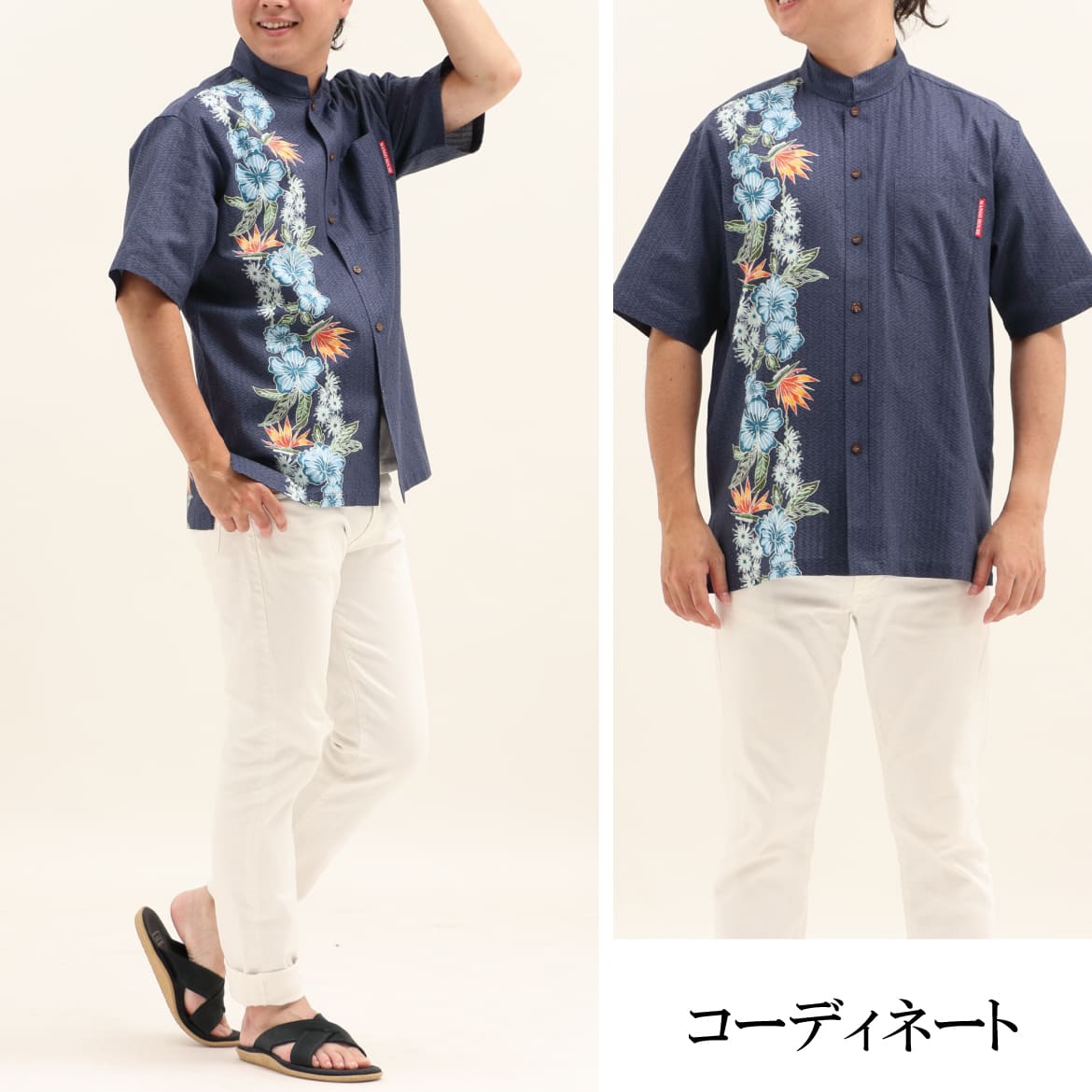 ハイビスカス、ストレチア、サガリバナを沖縄の伝統的な染め織り、紅型で表現。大胆な色使いと繊細なタッチは、涼しげでもシンプルなだけじゃない華やかさを身にまとえる沖縄のアロハシャツ(かりゆしウェア)。
