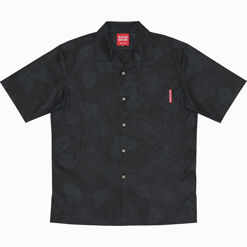 ここは島バナナの生いしげる沖縄のジャングル。美味しそうに実った島バナナと大輪のハイビスカスが沖縄の温暖な亜熱帯を表現した、自然豊かな沖縄のアロハシャツ(かりゆしウェア)。