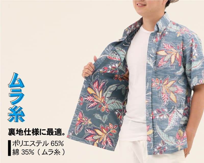 男の主役アロハシャツ。エスニック風に描かれたデイゴと月桃の花は、1枚で着ても絵になるデザイン。ムラ糸の生地が醸し出すヴィンテージ感がたまらなくカッコイイ。